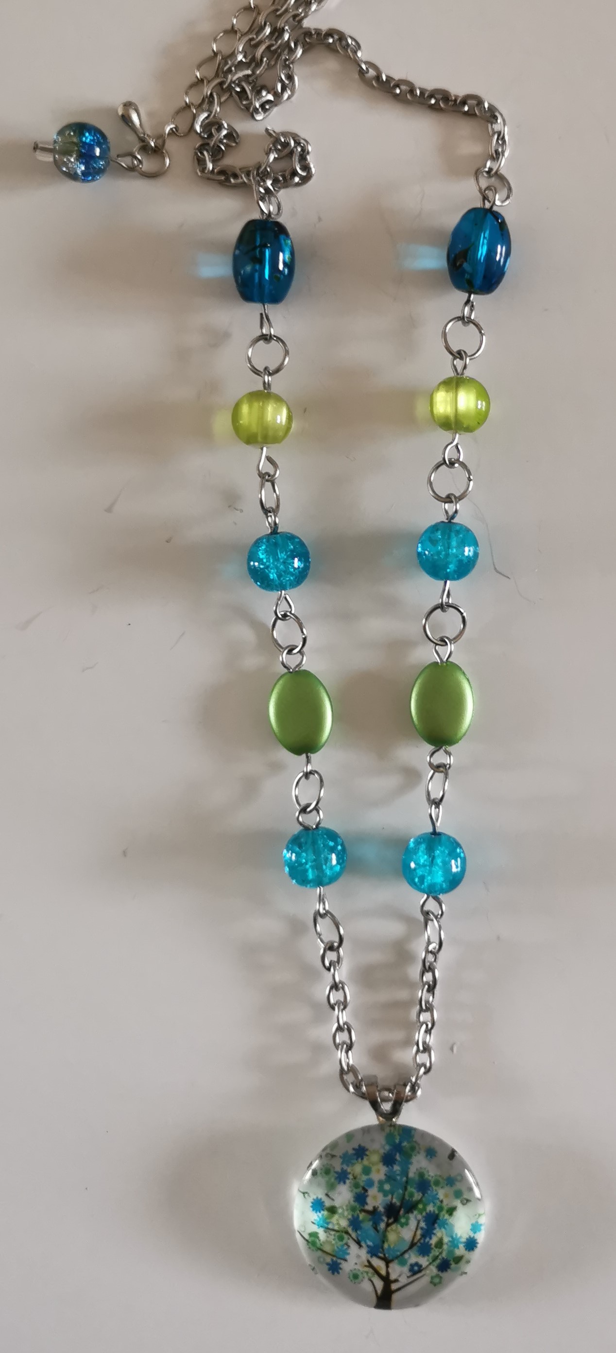 Chaîne en acier inoxydable avec perles vert pomme et bleu turquoise et médaillon arbre de vie.